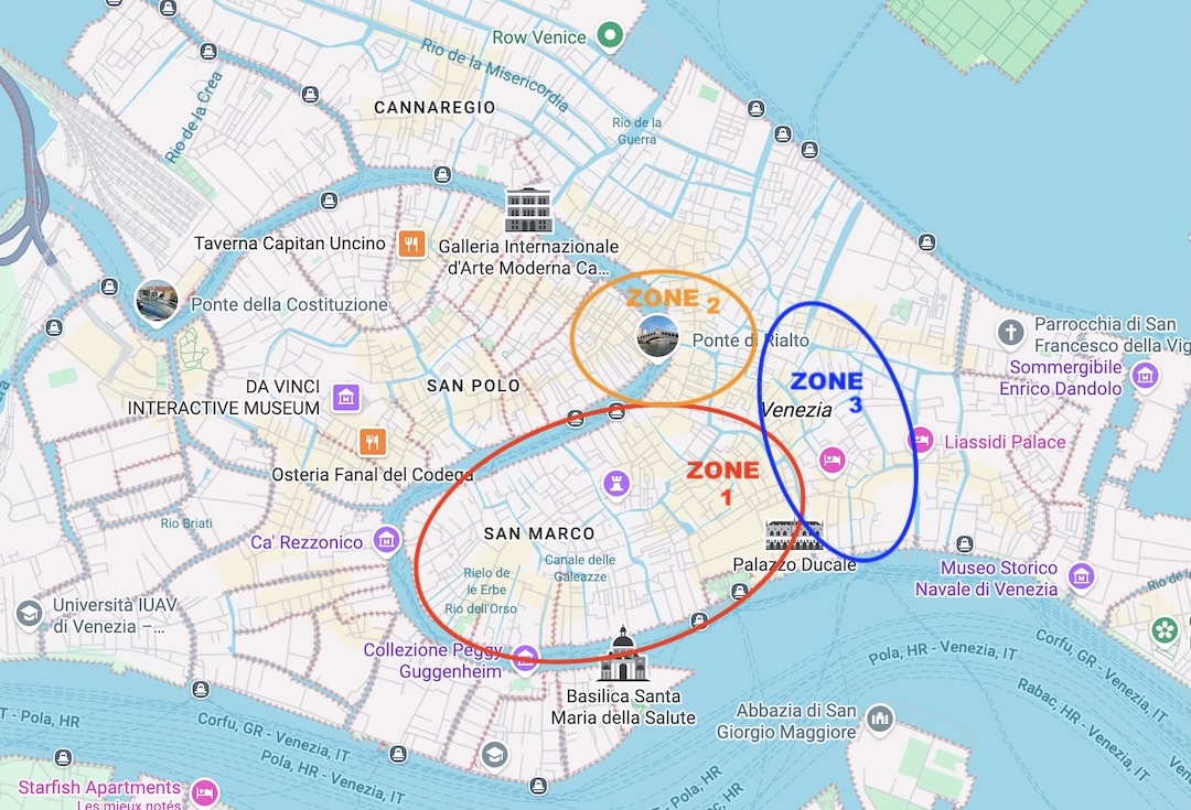 • Les abords du Rialto (des deux côtés du canal ; zone 2),