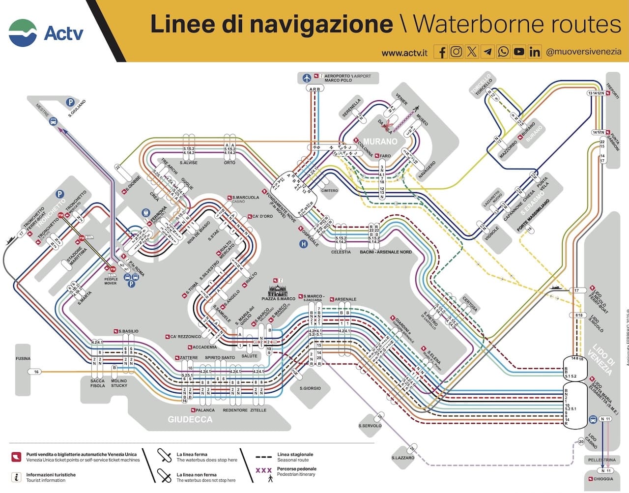 Venise compte actuellement une vingtaine de lignes de Vaporetto. Ces lignes permettent de naviguer dans les différents quartiers de la ville mais également de rejoindre d’autres îles plus ou moins proches comme La Giudecca, Murano, Burano, Torcello, le Lido, etc…